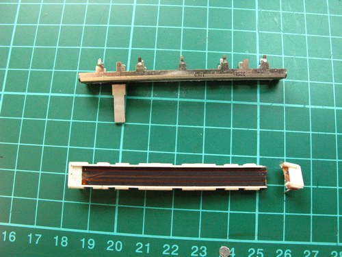 Taking the fader apart after de-soldering it from the Pcb the problem was obvious. Looks like it has taken a fair dunt at some time in its life, enough to crack the pcb and the plastic casing:-