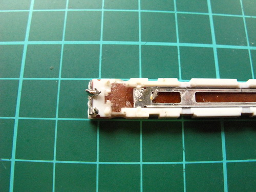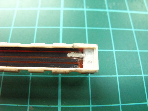 Here's the carbon track repaired with the conductive paint. Importantly the fader control doesn't actually run that far along so the paint should stay intact without being worn away, and luckily also the break is at the full-volume end which isn't often used: