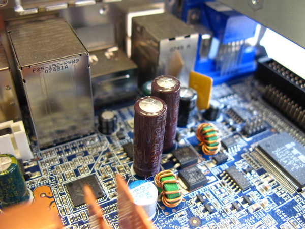 Measuring the capacity on my cap. meter they are down from 1800uF to about 800uF each. Such a loss it's easy to imagine the motherboard failing to cope with heavy DC supply rippling as a result of less supply decoupling.