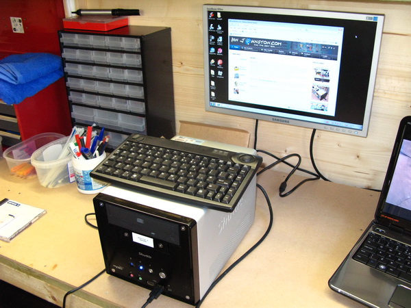 PS: Note the 19" LCD is permanently mounted on the wall for just such PC repairs, and my mini keyboard/trackball combo which is great for a cluttered workbench.