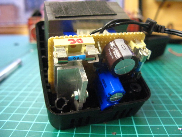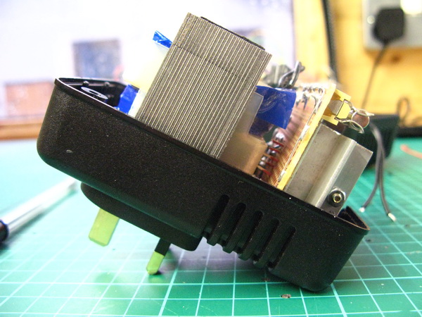However, with nothing readily available to hand and not really willing to buy a new one I reckoned I had enough parts in my workshop to build a simple switching PSU. So, looking through my bucket-of-bits I found a large 35VA 15v AC-AC Adaptor. In addition, it had enough space inside it to mount a pcb.