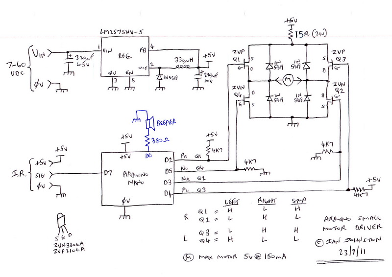 +5vdc is required for both the motor & Arduino and is derived from one of the main amplifier rails and is +40vdc unregulated, therefore a circuit with a higher operating voltage than normal in terms of voltage regulators is required. The LM2575HV-5 can operate up to 60vdc.