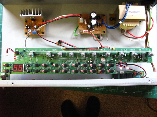 A couple of points regarding the power supply: As well as providing power to the amplifier pcb, it also provides +5vdc to the main board and slightly less than +5vdc to the LED circuitry on the main board, however, they use black for +5vdc, and red for 0vdc - Wierd eh! Also, the LED power is simply a 470ohm resistor off the +5vdc supply - Not a great design!: