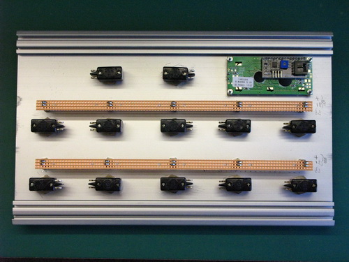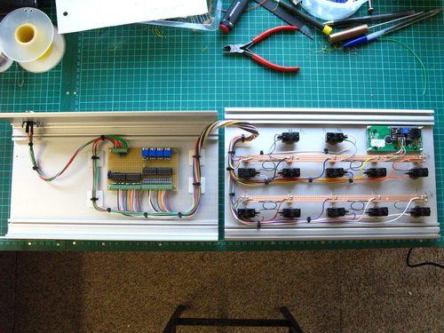 Here's the back side of the panel. You'll notice a couple of strips of veroboard which are soldered on the back of the LEDs, these are to save me attaching my wiring directly to the LED legs themselves as they are rather flimsy. In addition, the strips act to connect up the common sides of all the LEDs and push switches.