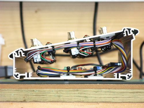 Close up of the front panel showing the loom off to the left coming in and interfacing to the switches, led's and the LCD display.
