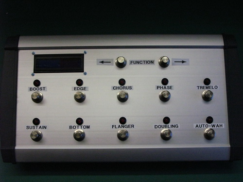 However, the down side is that there's no facility for connecting up an external pedal to control the effects, all those functions must be done on the amp itself. So, I decided to modify the amp by duplicating some of the panel controls down on the floor with a custom built foot-switch. A small wedge shaped enclosure and fitted out with 10off footswitches, associated on/off LEDs and a function switch. These are as follows:-