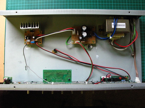 Here's the internal electronics, the final stage amp (TDA-2050) on the left and the power supply including the transformer to the right of it. These 3 items will be replaced with my new kit.