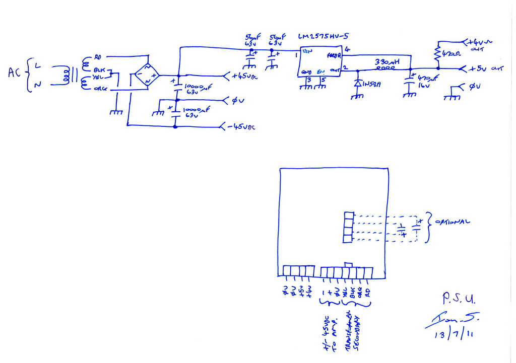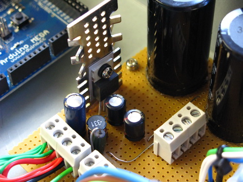 Assembled so far are a couple of nice audio grade 8200uF 56v electrolytic caps, and and an off-board bridge rectifier. The outputs will be +/- 45vdc for the main amplifier, and +5vdc & +4vdc for the Zoom electronics, Arduino and the other pcb's.