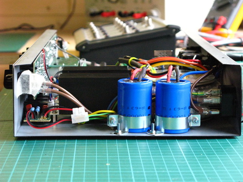 15/07/11 - I added some additional external capacitors on the power supply bridge rectifier, the more the merrier as they say. With these new 10,000uF 63v caps there's now a total of 18,000uF on each rail at the Psu. Not much space left inside the case!