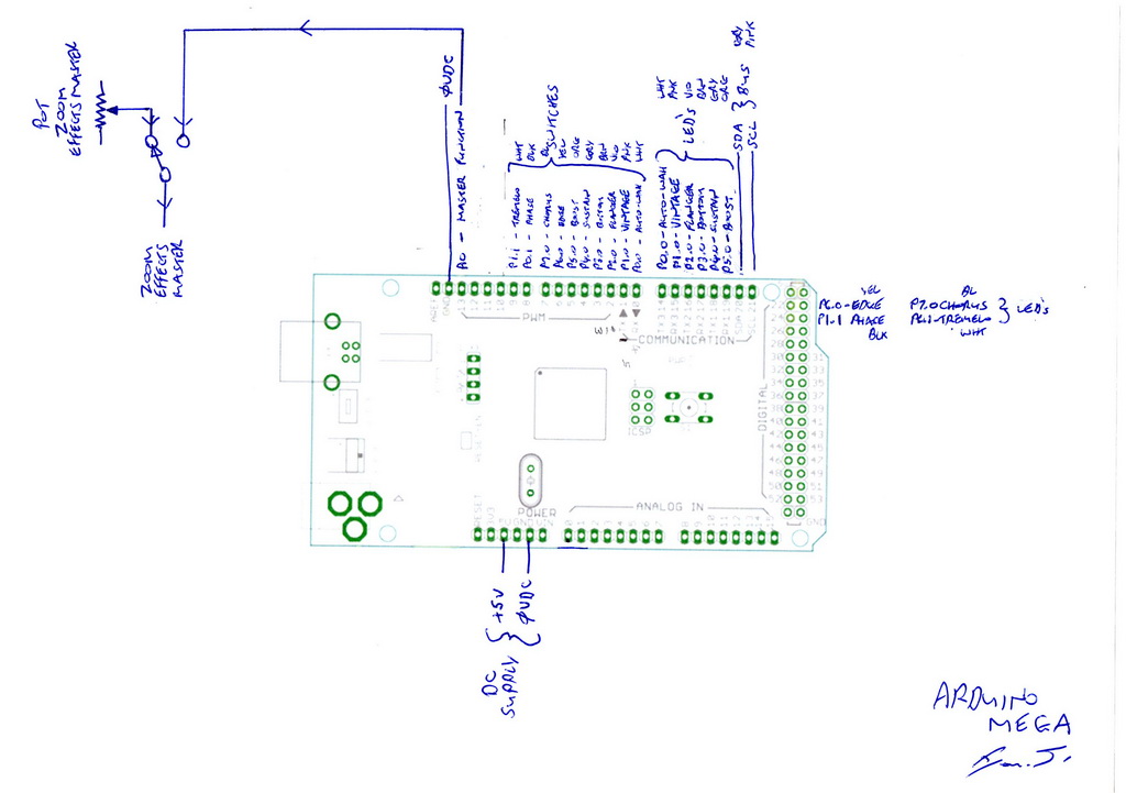 I've also managed to put in some test code for the Effects Master Select switch for proof of concept. The Zoom selector switch (pot) now interfaces to the Arduino, and the Arduino then controls the Zoom Processor board. This is so that I can ultimately have control over the Zoom board, or indeed let the Zoom selector pot 'write through'.