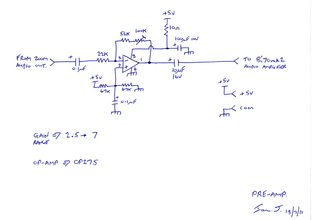 18/07/11 - Home built pre-amp added. This is to boost the Zoom pre-amp up from around 300mV to 700mV and more suitable for the Bi70mk2. The add-on is based on an OP275 op-amp which I had laying around and which has the necessary high slew rate for audio applications. It's running off 5vdc.