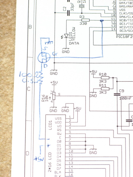 Finally!......here's a last minute modification. It struck me it might be a good idea to have the backlighting of the LCD flash with the VIDEO LED, thus making it much more obvious of how well the data is being received. Here's the circuit modification. The backlighting of my LCD is 5v 82mA, so very easy to hook up via an N-channel FET (ZVN3306A). Please check your own LCD datasheet.