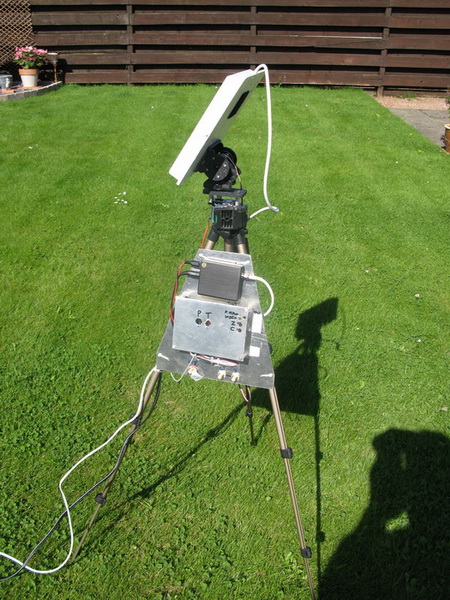 There's a 2.4gHz 14dB directional patch antenna on a pan/tilt servo mechanism which is cabled down to a local 2.4Gz receiver which outputs the audio/video signal from the camera on the plane. The video signal interfaces to the Lynx PCB (behind the small metal cover) where the software strips the GPS co'ordinates/data and uses it to orientate the antenna via the servo's.
