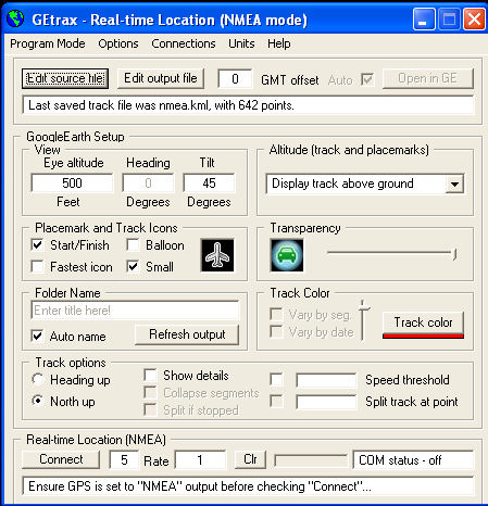 So back to the standalone programs. There are any number of these apps, however I only found two off them to date that seemed to work with the Lynx NMEA serial output. These programs read the NMEA data and convert it to KML data files that Google Earth can read real-time. As follows,