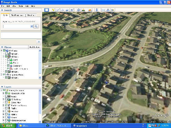 The following screenshot is the system actually running. The DakarOSD & Lynx are both operational, the NMEA data is being input via the com port of my laptop, GEtrax is work and the data is being fed to Google Earth. When Google Earth starts up it should immediately direct to your current GPS position and trace your movements. I was testing from my back garden as base, so the screenshot below is my street! Sorry you can't see many 'traces' as I wasn't moving around much!