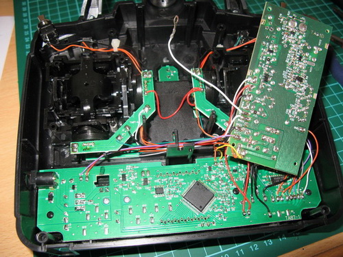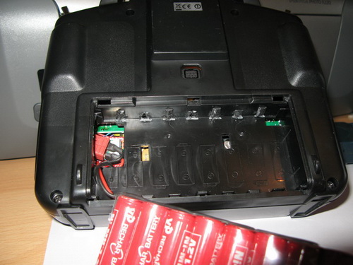 Finally, I changed the battery type and capacity in order to give the system at least 10hrs continious use, more than enough for a days flying. Snipping the small plastic tags in the battery bay gave me just enough room to squeeze in a 2400mAh NIMH 12vdc battery pack.
