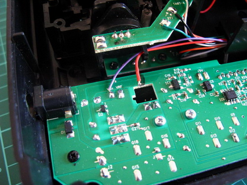 Next, I wanted to make the system as economical on battery power as possible, so I saw no sense in having the original 35Mhz Tx within the radio to be powered up not to mention having to worry about 35mHz channels/xtals. The easiest way was to disable the power to it. I couldn't remove it completely, as I said above it also doubles as the buddy connector. So I simply disconnected the red wire from the solder terminal marked VRF, which is effectively the power to the 35Mhz amp. With this disconnected 100mA is saved.