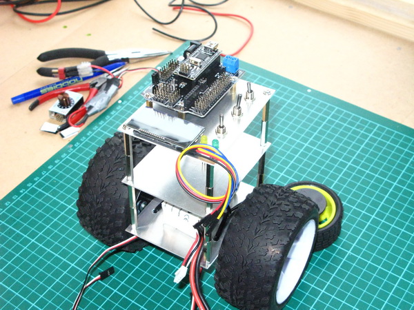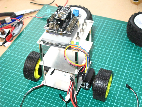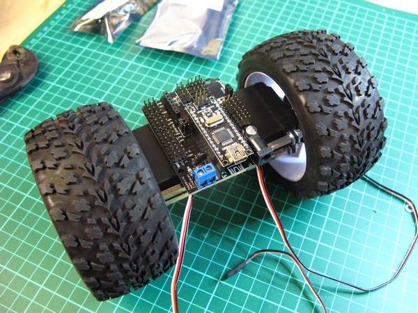 Arduino, 2x16 serial LCD, battery, switches and status LED's dry fitted. Large wheels option:
