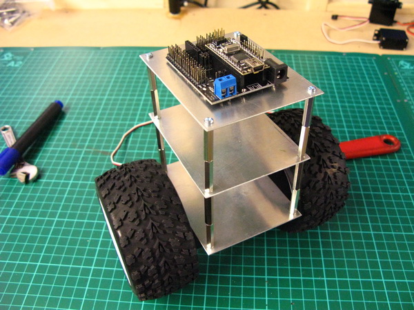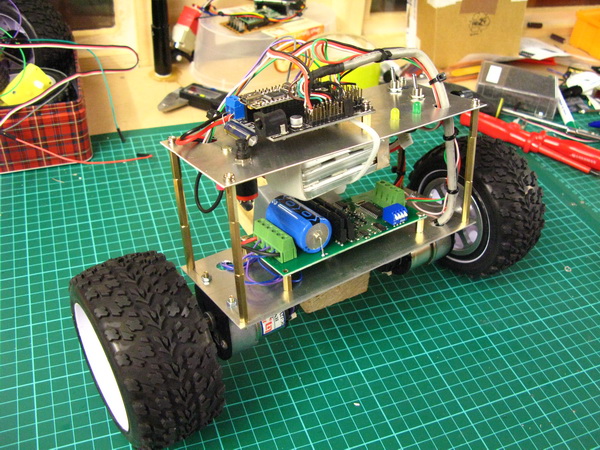 - MD22 Dual 5amp H Bridge Motor Driver (modified to by-pass the on-board PIC and have the Arduino drive the MD22 final stage directly)