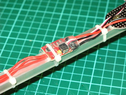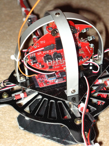 Shown here is the Rx mounted below the PWB. I'm using PPM direct from the Rx to the PWB, you can see the 3 wires in the foreground running from the PWB.