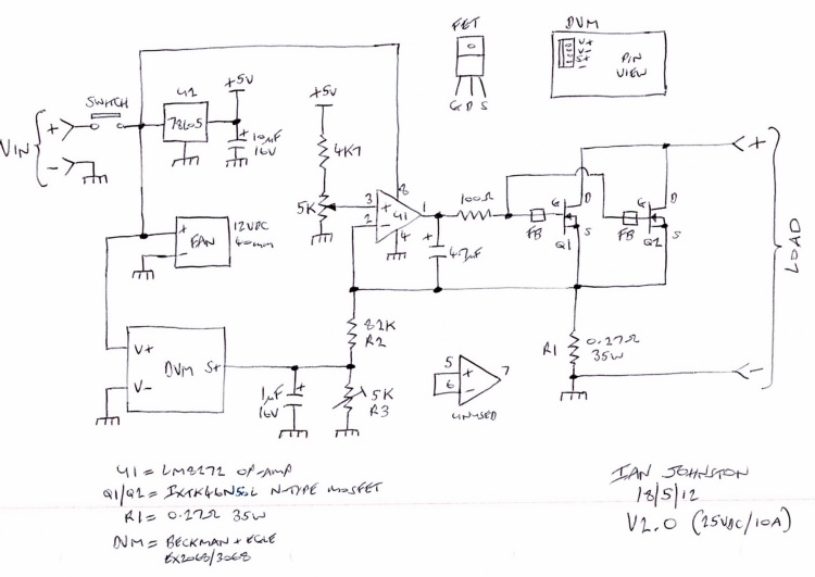 The design is based around an N-type mosfet and an op-amp. A 10-turn potentiometer controls the load and displays this in amps via the on-board LCD. Basically, the circuit provides a constant current sink to the supply being tested and irrespective of the voltage of the source.