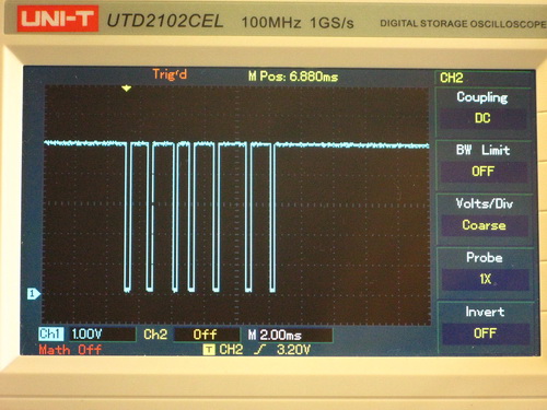 Here's the PPM output from the Arduino showing 6 channels running. The PPM protocol is a very simple serialization of the servo PWM commands, separated by a long syncronization pulse. The range of each channel pulse is 700uS to 1700uS, and you can see ch.3 (throttle) at minimum, whilst ch.5 (aux switch) is at maximum.
