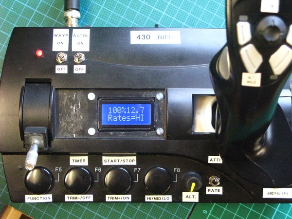 The joystick for controlling Ael, Ele & Rud and making use of the thumb-stick at the top for trim adjustment. On the body of the unit itself the throttle and there's 4off pushbuttons for rates & trim adjustment, the 8*2 LCD and the TI (Thermal Intelligence) pot and switch. This is on the 6ch version software:-