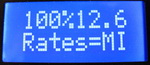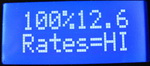 Main screen showing battery capacity (%) and the voltage. Also, the current Rates selected.