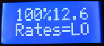 Battery capacity/voltage, Hi/Mid/Lo Rates, Ael/Ele/Rud Trim, Timer & the Test mode showing PPM output (uS) & Raw analogue inputs (counts).