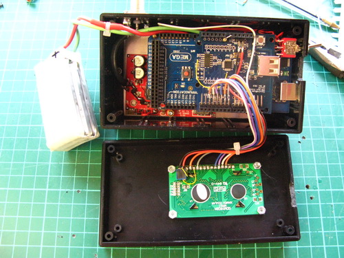 The Lcd is mounted on the lid, the battery, Tx pcb, Arduino Mega and Usb Host Shield: