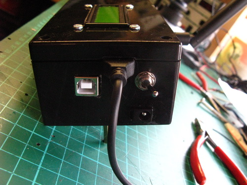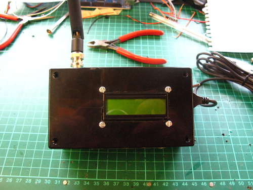 2x16 Lcd on the top, antenna out the back, power switch on the side alongside the charge socket and Arduino USB connector: