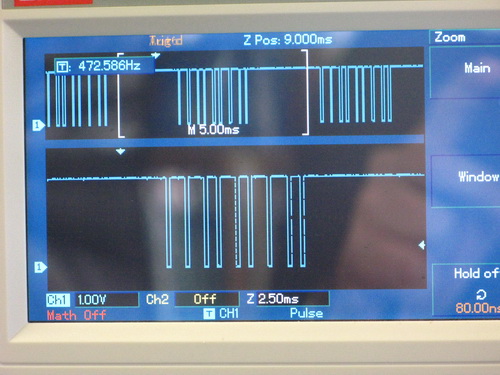 Here's the PPM output from the Arduino showing the 8 channels running. The PPM protocol is a very simple serialization of the servo PWM commands, separated by a long syncronization pulse. The range of each channel pulse is 700uS to 1700uS.