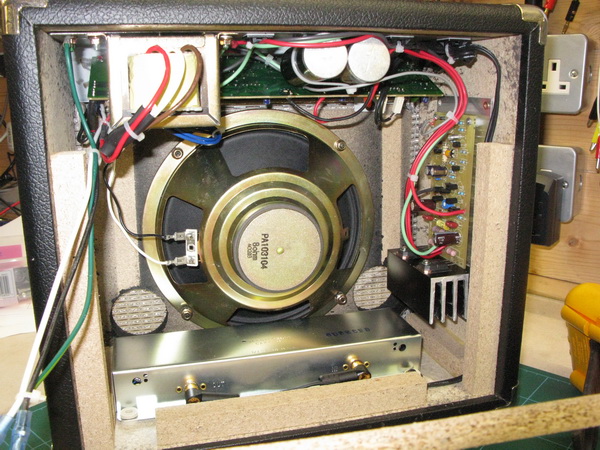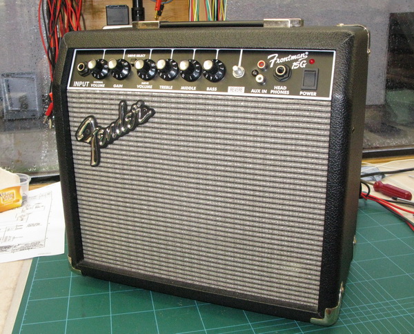 My wee Fender Frontman 15G guitar amplifier is only good for basic practising on my own, so I set about with an idea to get the power up and the sound quality improved.