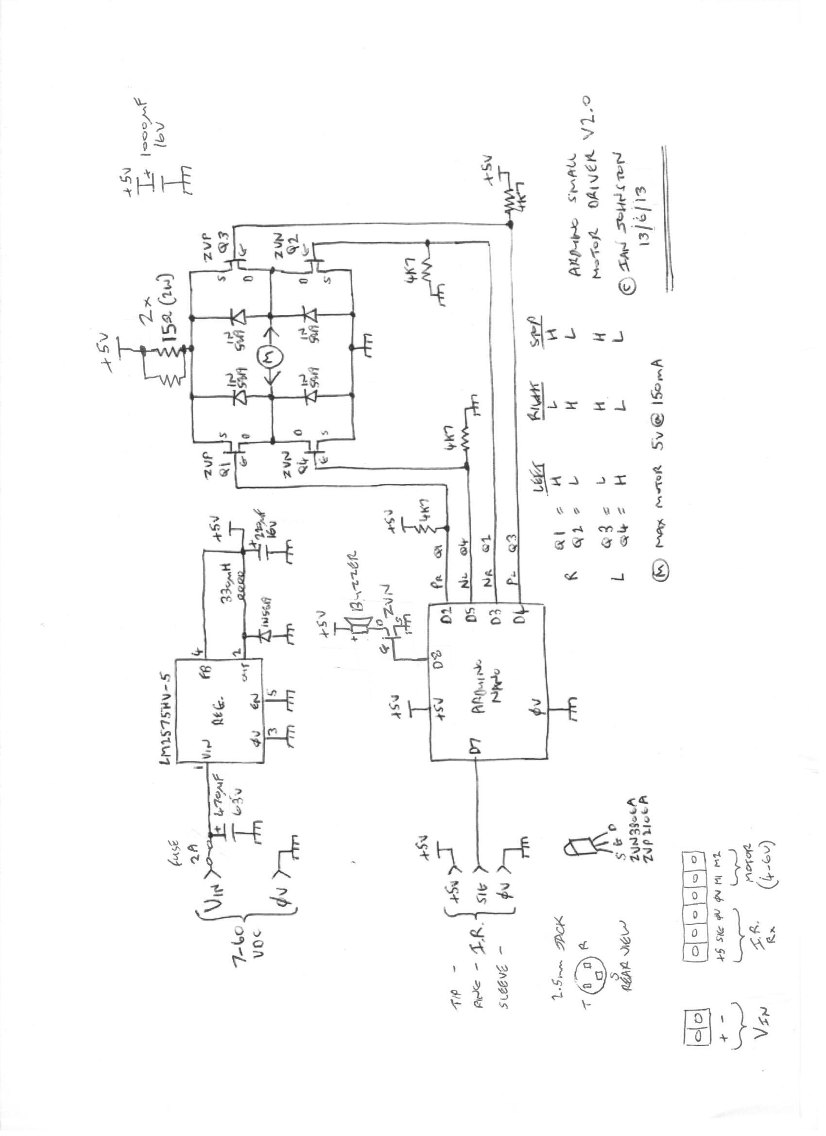 As this amp will be in use at least 12hrs per day I wanted a safe design so decided to install 7.5ohm (2x15ohm 2W) resistor in series with the supply to the H-bridge. The DC motor is rated at 100mA (@5vdc) nominal, 150mA max.