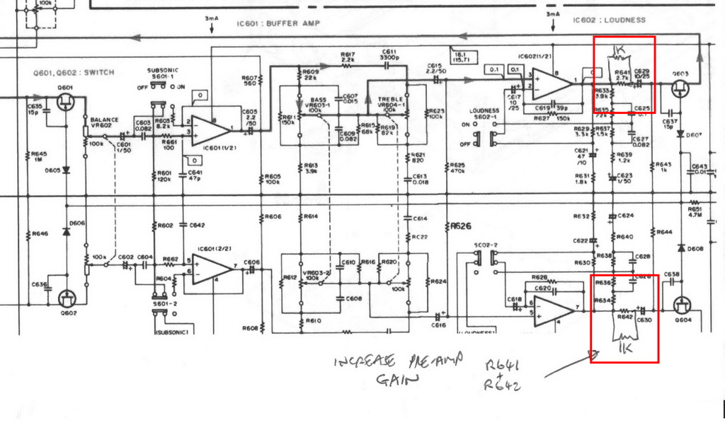 My own setup has a reduced LINE level (from the Tv) in terms of voltage so i've actually modified my amplifier in order to increase the gain of the pre-amp. R641 & R642 I have put a 1k resistor in parallel with the existing 2.7k resistors. Modified schematic here (jpg) for info.